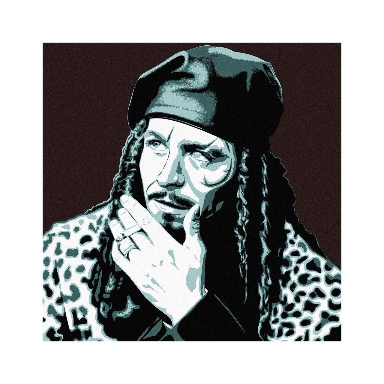 Gary Oldman is an Oscar winner and one of the most respected and revered actors ever. But to me, his best work is still playing the disgusting pimp Drexl Spivey in True Romance. Drexl is a central character to the story, though Oldman is essentially only in one scene ... a legendary scene so good it would have stolen the whole movie if not for the Walken/Hopper scene. This piece features the only instance of stippling found here at Plaid Design; stippling is an art technique of using tiny dots or specks to produce a rich, detailed shading effect. I only used it here on Drexl's hat to add a texture effect because it is made of leather. Stippling was also the technique I used in my piece "Spoonbill," for which I won the national Congressional Arts Award. It looks cool, but takes FOREVER. Rarely do I stipple anymore, but I felt Drexl here was worth the extra time.
