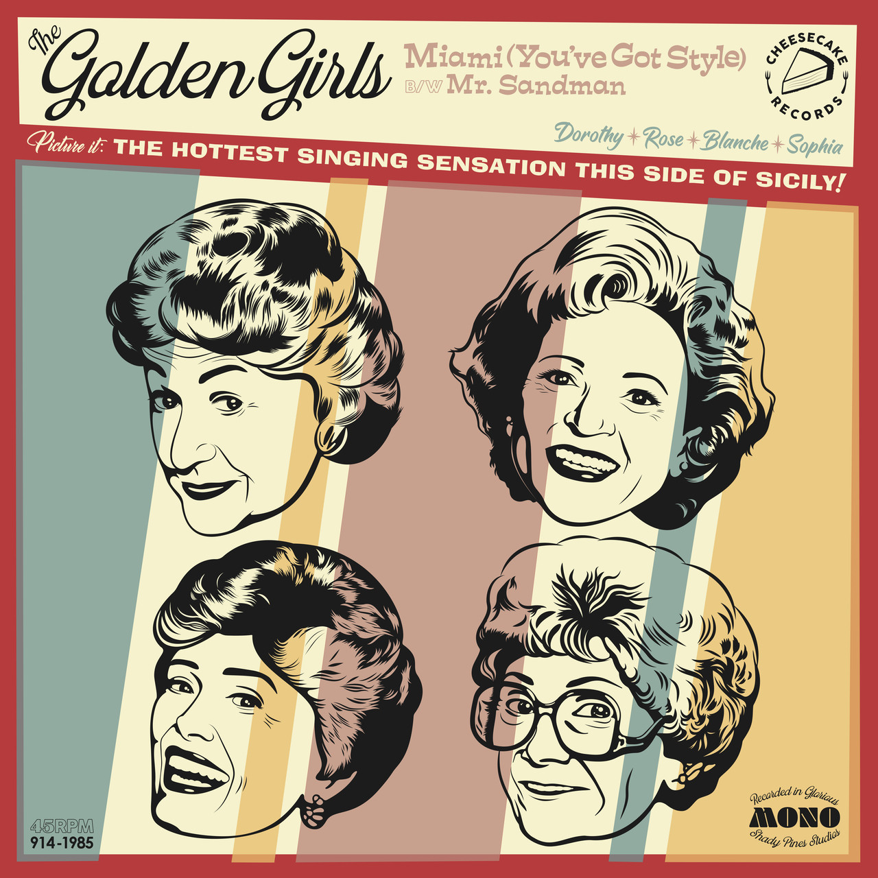 Here we have the cover art for The Golden Girls' hit single "Miami (You've Got Style)" from the classic episode in which Rose and Dorothy write a song together for a contest; it's such a great episode (and actually not a bad song)! The B-side, of course, of this made-up scenario is their iconic cover of Mr. Sandman. I've been creating album and single cover art for musical artists for many years, but I recently came up with the concept of doing cover artwork for pop culture icons that weren't actually musical groups, the first being my "Ghostbusters: We Came, We Saw" fake LP cover. And now I'm kind of addicted. As I continue down this path of creating vintage-inspired cover art for my non-musical pop culture heroes, I'm realizing this is pretty much my favorite thing to do in the realm of graphic art. Only problem is these suckers take A LOT of time! But one day I hope to open an art show with an entire series in this style. So if you dig this kind of weird stuff and want more, please be patient, and as always, stay tuned!