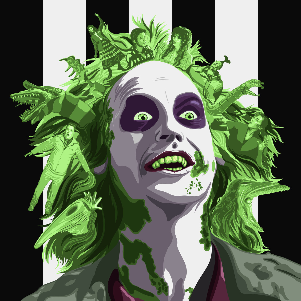 He's right, you know; it is indeed showtime ... for this edition of Horror/Halloween-themed artwork, a Plaid Design tradition each October since 2015! (I also snuck in "Double Over" in June 2017, for those keeping score.) Here's my tribute to one of my all-time favorite films, Tim Burton's Beetlejuice. As a kid I completely ruined this movie on VHS, watching it over and over and over (only Joe Versus the Volcano, Stand By Me, The Breakfast Club, Spaceballs, and a few select others rivaled it in views). Because of my love for this not-talked-about-enough masterpiece, I wanted to go BIG. So I did just that, spending several weeks in a row working "open-to-close" with zero days off, completing not one, not two, not three - OK, you get the idea - I did TEN (10) separate works; in fact, this was the first year I'd done a full collection of Mod Pop Art for Halloween Season. And this one here is what they call the ol' pièce de résistance ... the culmination of all 10 pieces combined. I like artwork that looks one way from a distance, and then reveals cool details as you walk up and take a closer look (see "A Link to the Past," for example). And this is what I tried to do here with our pal Betelgeuse (take a gander at the hair to fully appreciate all the references). And let me tell you, Beetlejuice is such a visual feast full of so many iconic images that it was insanely difficult to narrow it down to the 11 individual subjects I selected. I still feel bad for some of the ones that didn't make the final cut, like poor Juno, Miss Argentina, the minister, the lost souls, and of course, Robert Goulet. Maybe one day I'll do "It's Showtime 2," but for now I can only hope that fellow fans will enjoy my tribute - my love letter, to be more accurate - to Burton and the exceptional cast and crew of the wonderfully strange and unusual Beetlejuice.