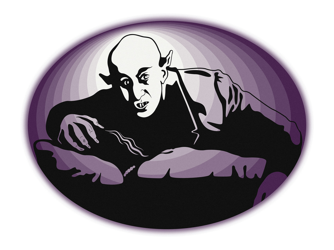 I love the scene in Nosferatu, eine Symphonie des Grauens after Count Orlok bites Ellen Hutter's "lovely neck" (a reference to a terribly alarming line of dialogue in the film, and the title of this piece). As Orlok slowly looks up, with his twisted claw wrapped around the head of his victim, he stares directly into the camera for a beat, which makes for one of the creepiest scenes ever. As I often do, I captured my own still of this scene for reference and tried to pay tribute to the moment by painting in a dark, minimal 2-tone feel inspired by the grim but stark look of the movie. To contrast the near-black brushwork, I created a graphic background with my signature gradient banding in purple. Then I fit everything into an oval with a grainy vignette to sort of fuse vintage and modern into one look and tie it all together.