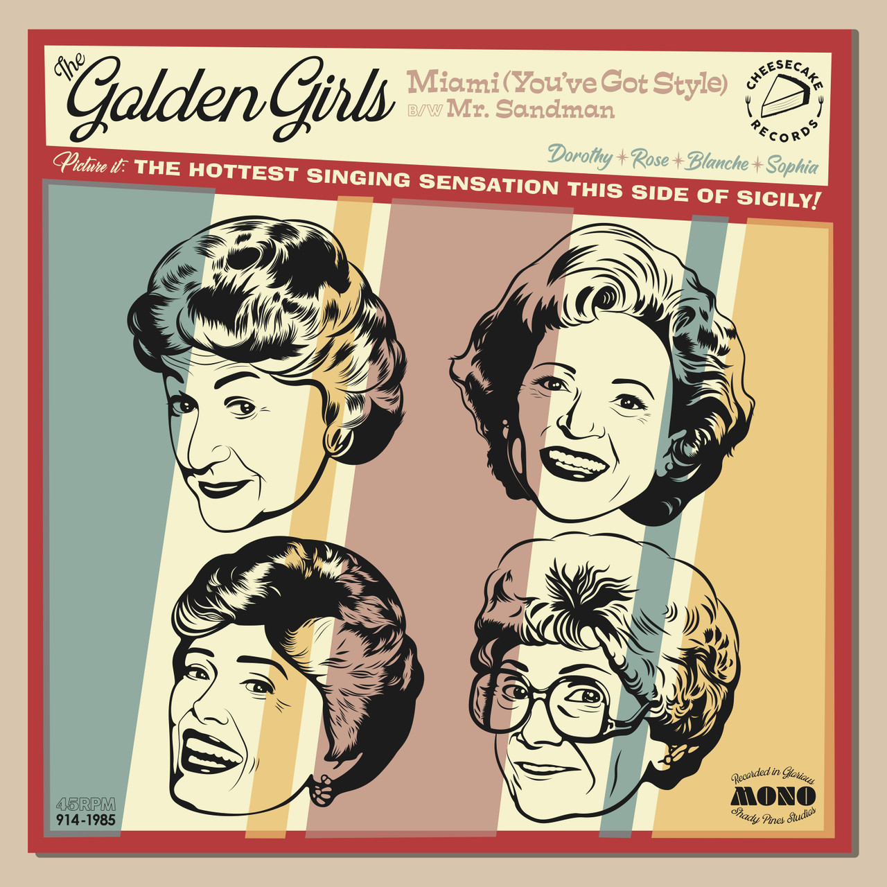 It's the official Plaid Design T-shirt based on John's original artwork, "The Golden Girls' Hit Song"! This Mod Pop Art apparel — an imagined 45 RPM single record cover for The Golden Girls' song "Miami (You've Got Style)" — is made of super high-quality 100% ring-spun cotton; it's soft, comfortable, and fits true to size. The double stitching on the neckline and sleeves add more durability to what is sure to be a favorite. Don't leave home topless — buy this shirt!